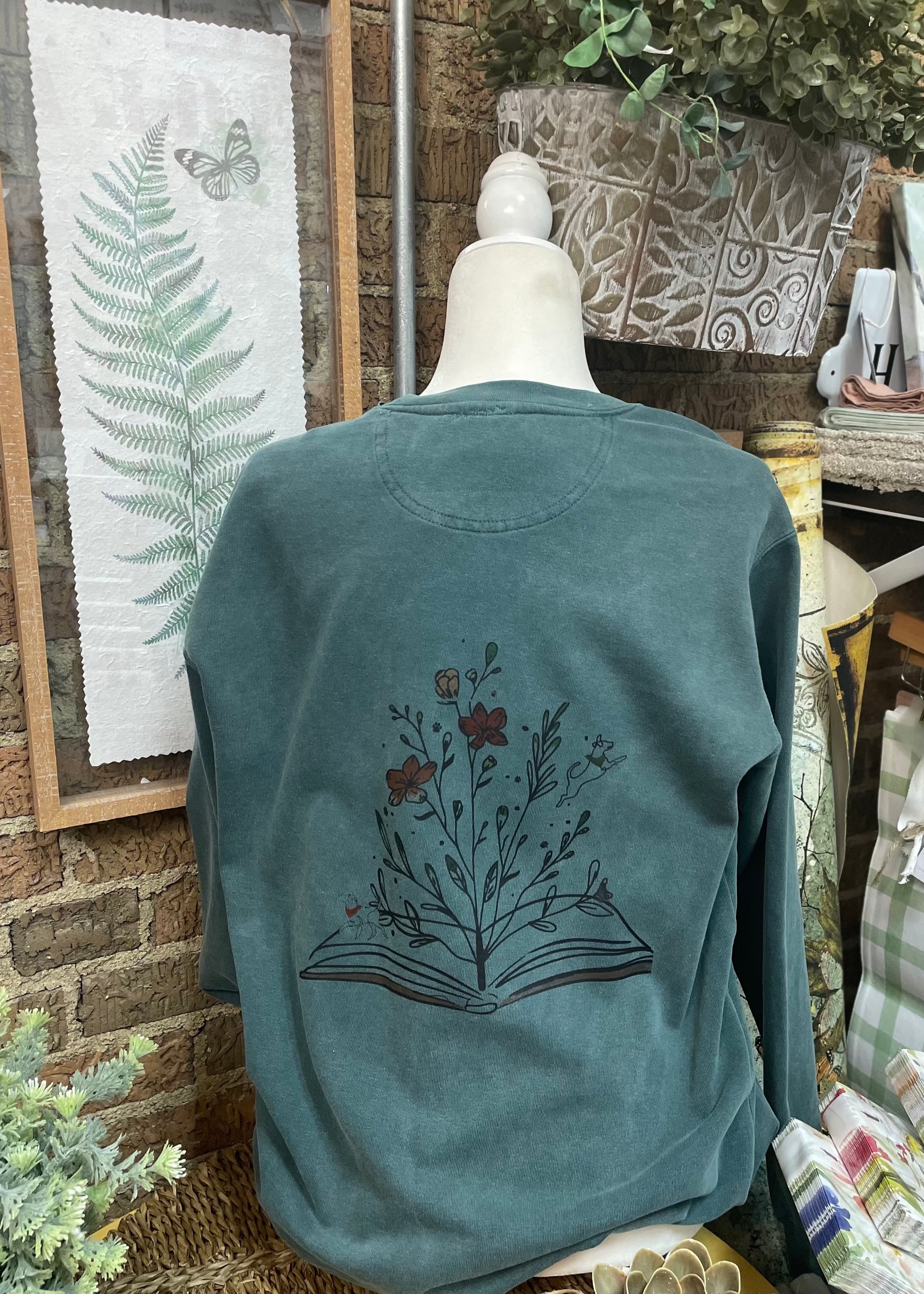 Screen printed design featuring an open book with flowers and dogs on a comfort colors sweatshirt.