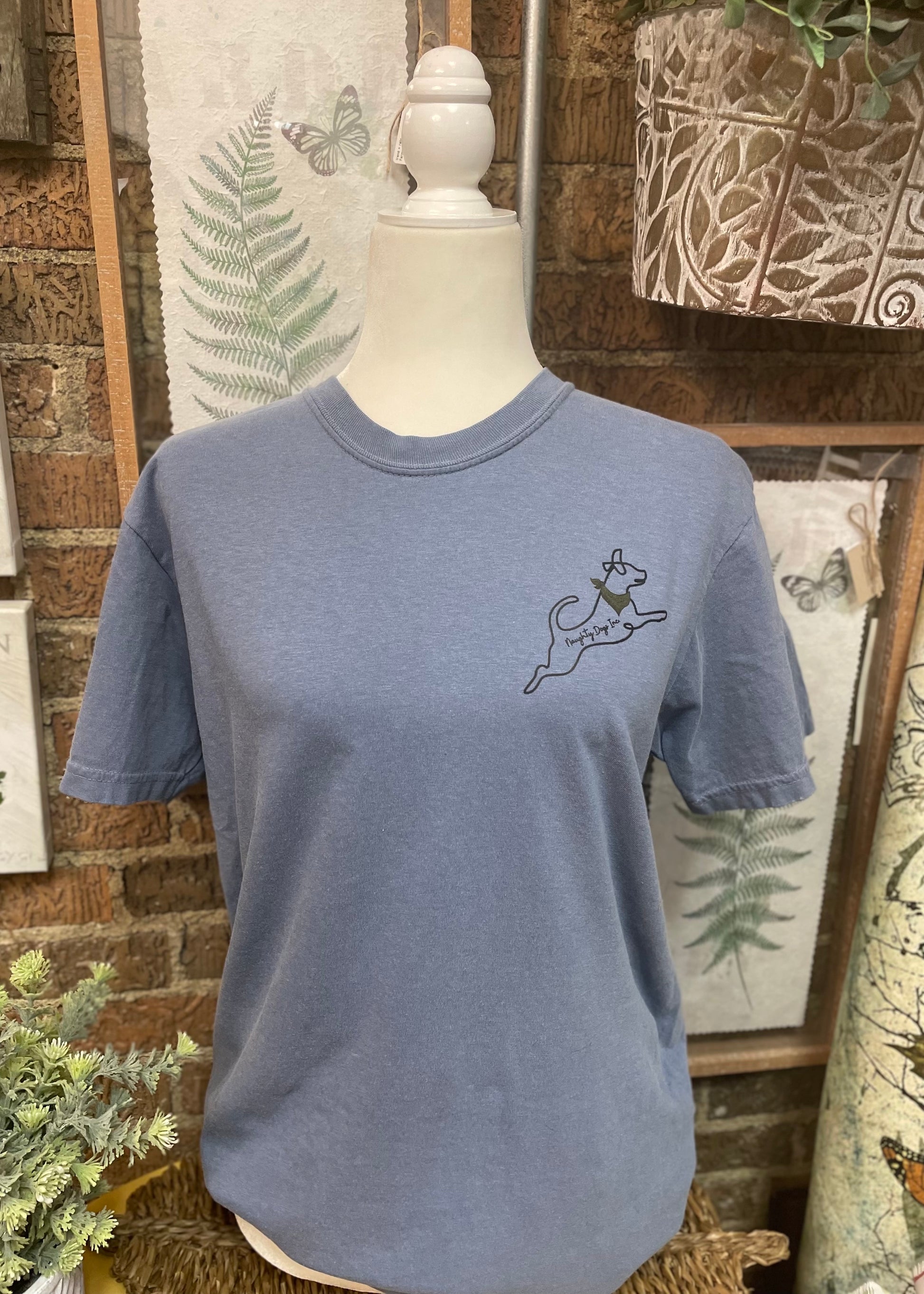 Screen printed design featuring an open book with flowers and dogs on a comfort colors shirt.