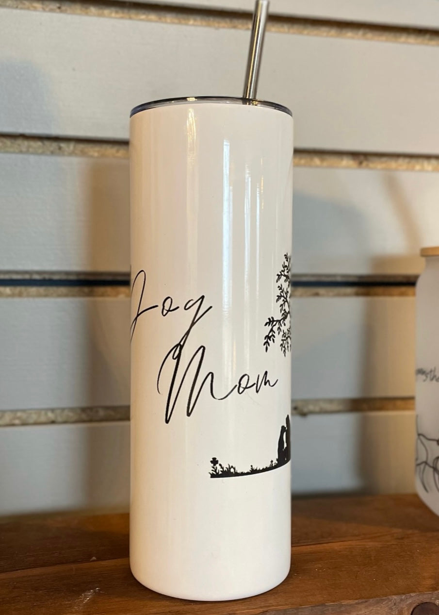 This 20 oz stainless steel tumbler features our "dog mom" design and comes with a clear lid and metal straw. The perfect accessory to your favorite on-the-go drink!