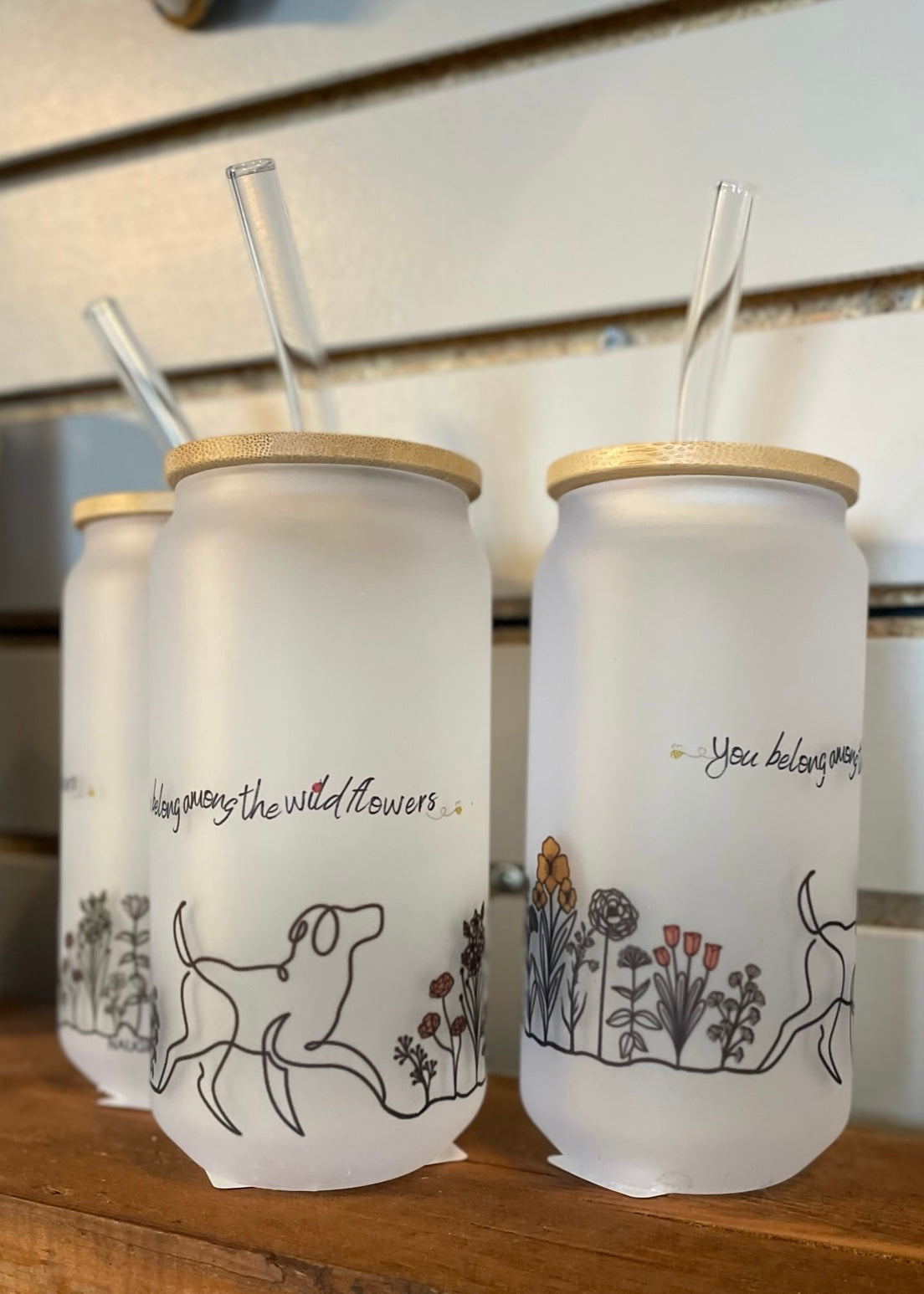 This 18 oz frosted glass features our unique original "you belong among the wildflowers" design and come with a bamboo lid and clear glass straw. The perfect accessory to your morning iced coffee, beer, soda or any cold drink!