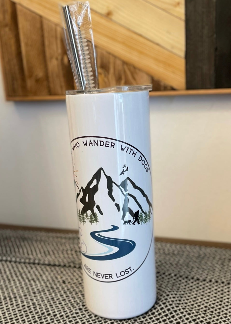 This 20 oz stainless steel tumbler features our original "those who wander with dogs are never lost" design and comes with a clear lid and metal straw. The perfect accessory to your favorite on-the-go drink!