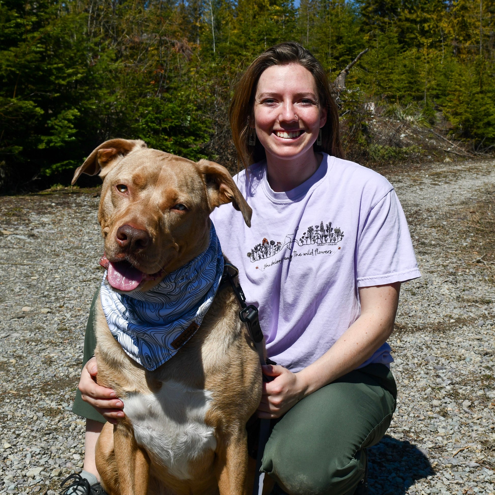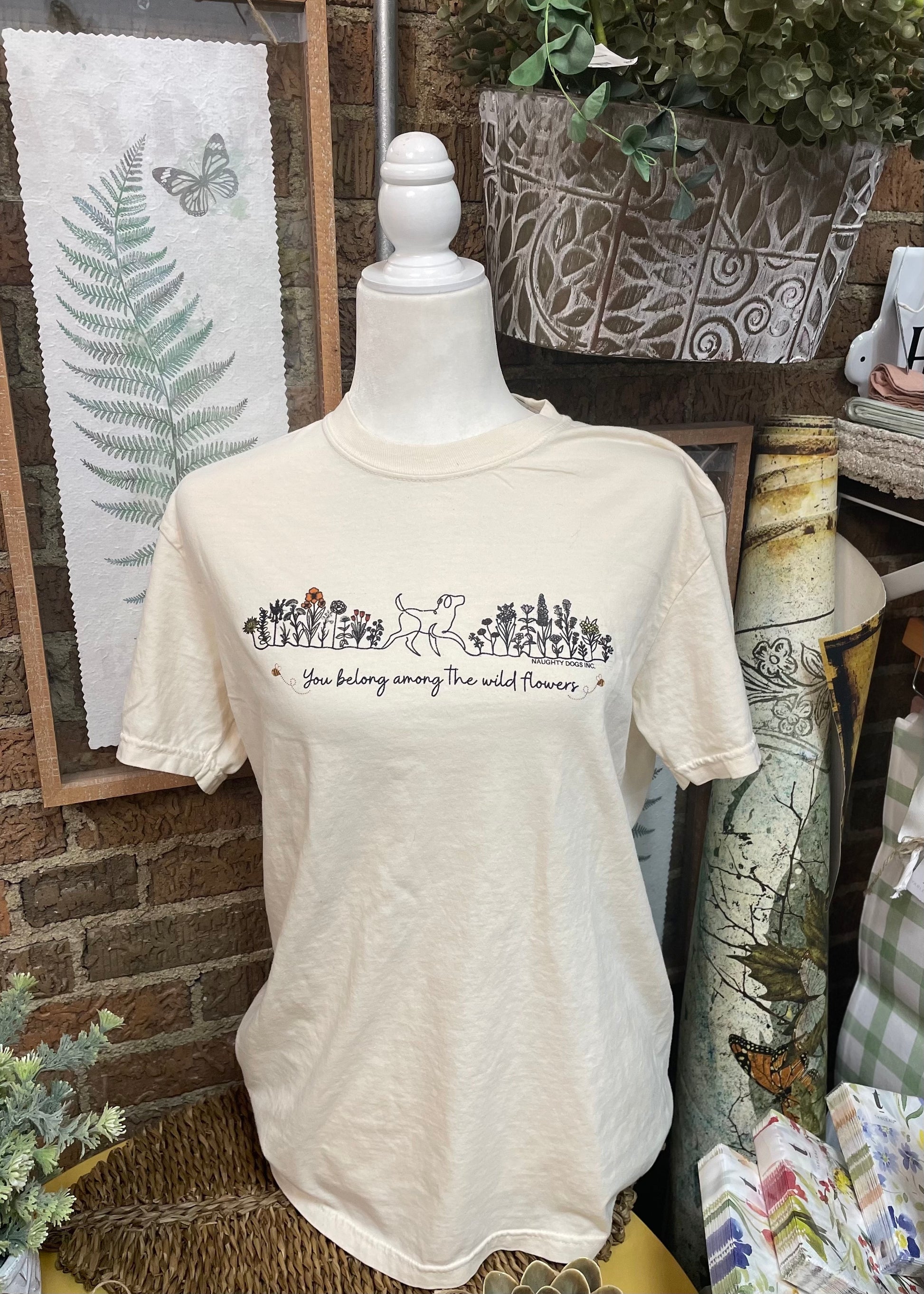 Screen printed design featuring a dog and wildflowers on a comfort colors t-shirt.
