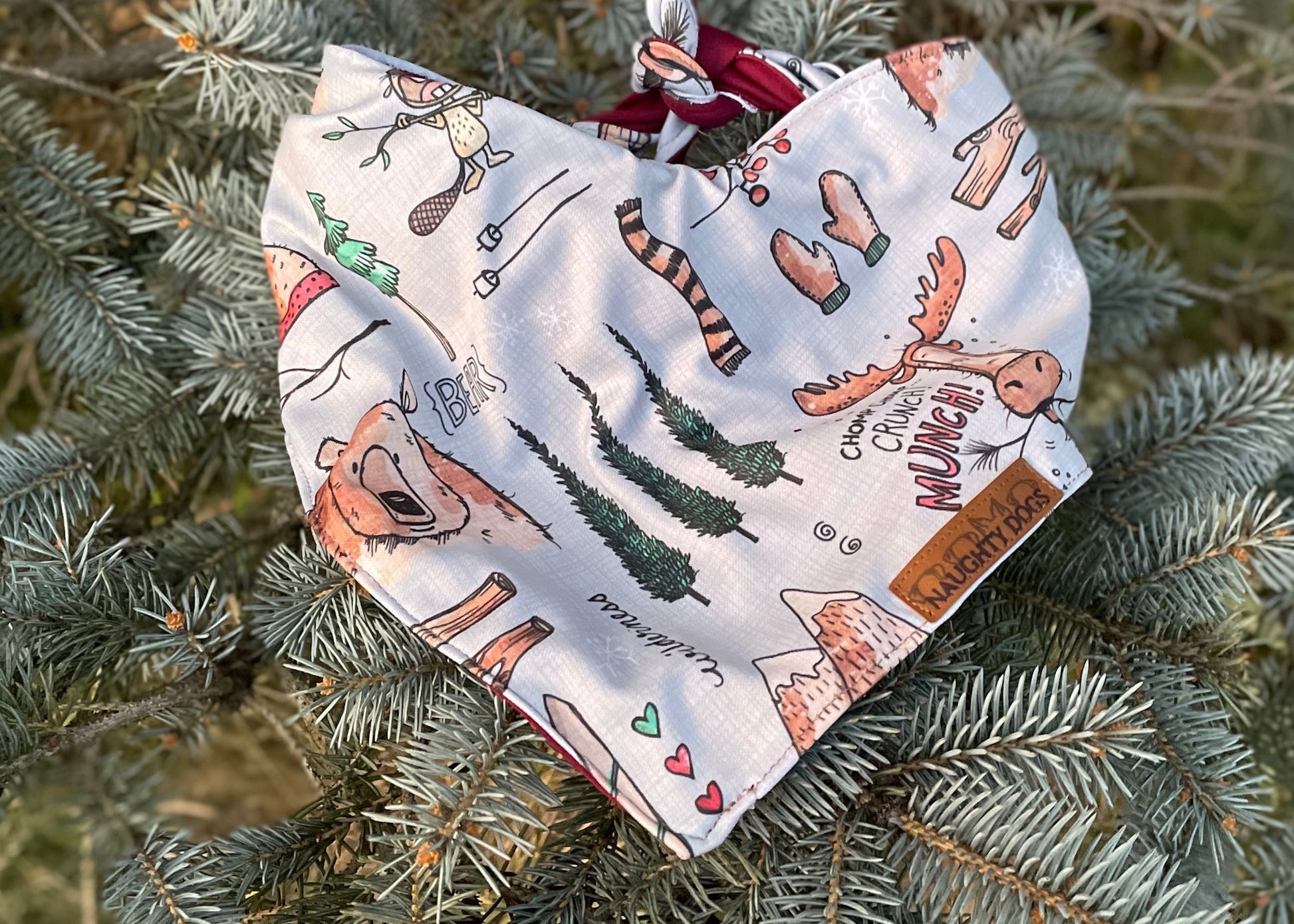 The Winter Woodlands Bandana features a cute design with bears, moose, skis, pine trees, and other winter essentials for those winter-loving pups!